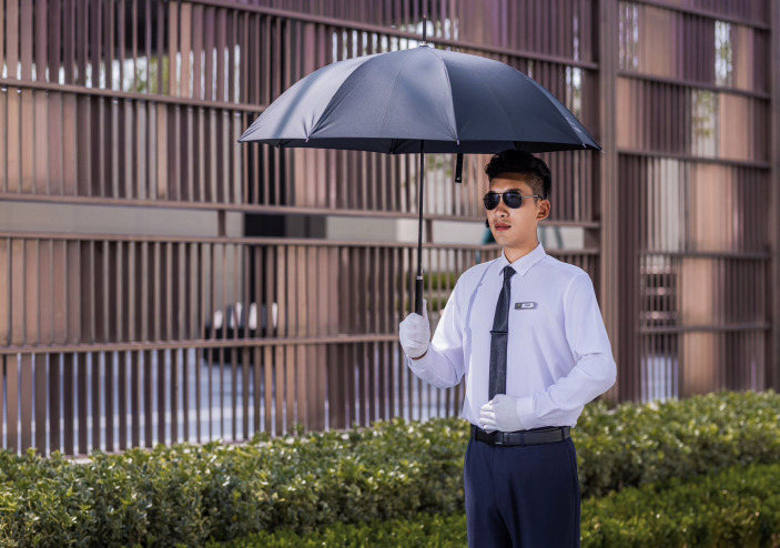 禮賓人員站姿、跨立、敬禮,每一個動作都鏗鏘有力,禮貌問詢、停車指引、遮陽服務、雨停服務等,細致周到的禮賓服務讓到來的每一位客戶都感受到賓至如歸的親切感。
